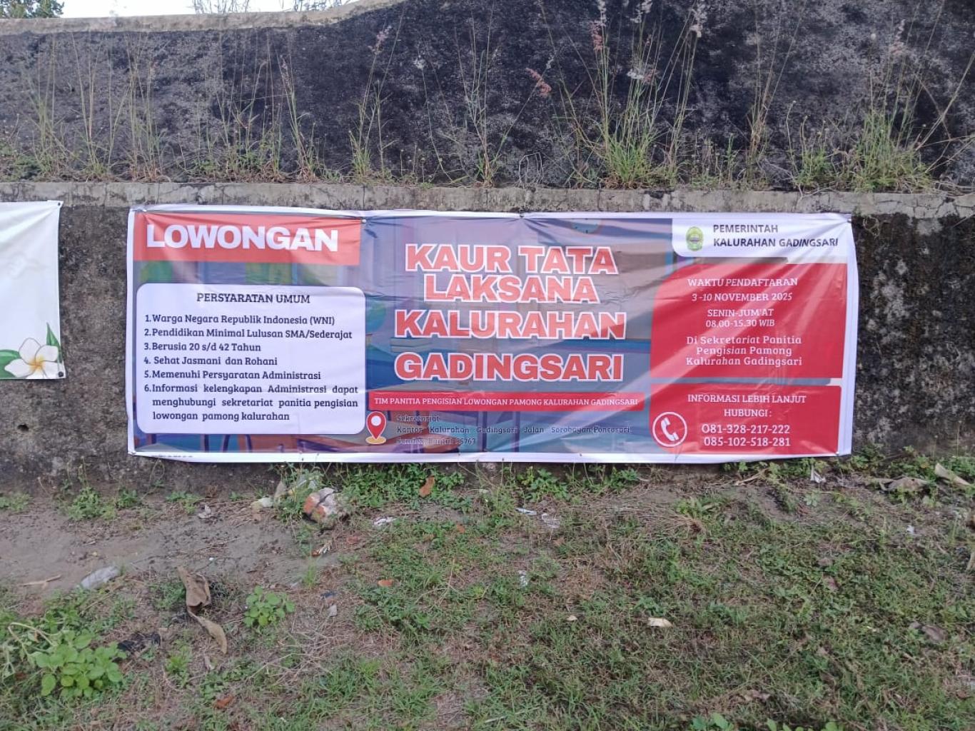 GadingsariNews - Jumat (17/10/2025) Panitia Pengisian Lowongan Pamong memasang banner pengumuman Pengisian Lowongan pamong di tempat-tempat strategis di wilayah Kalurahan Gadingsari.